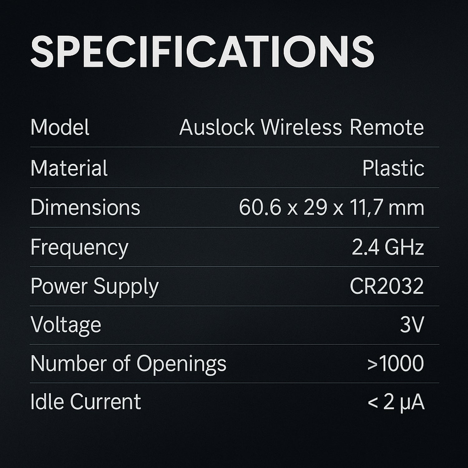 The Auslock Wireless Remote Key is the perfect companion for your Auslock Smart Lock. Designed for fast, easy access without needing a smartphone, this remote provides physical control over your door lock from up to 15 metres away.